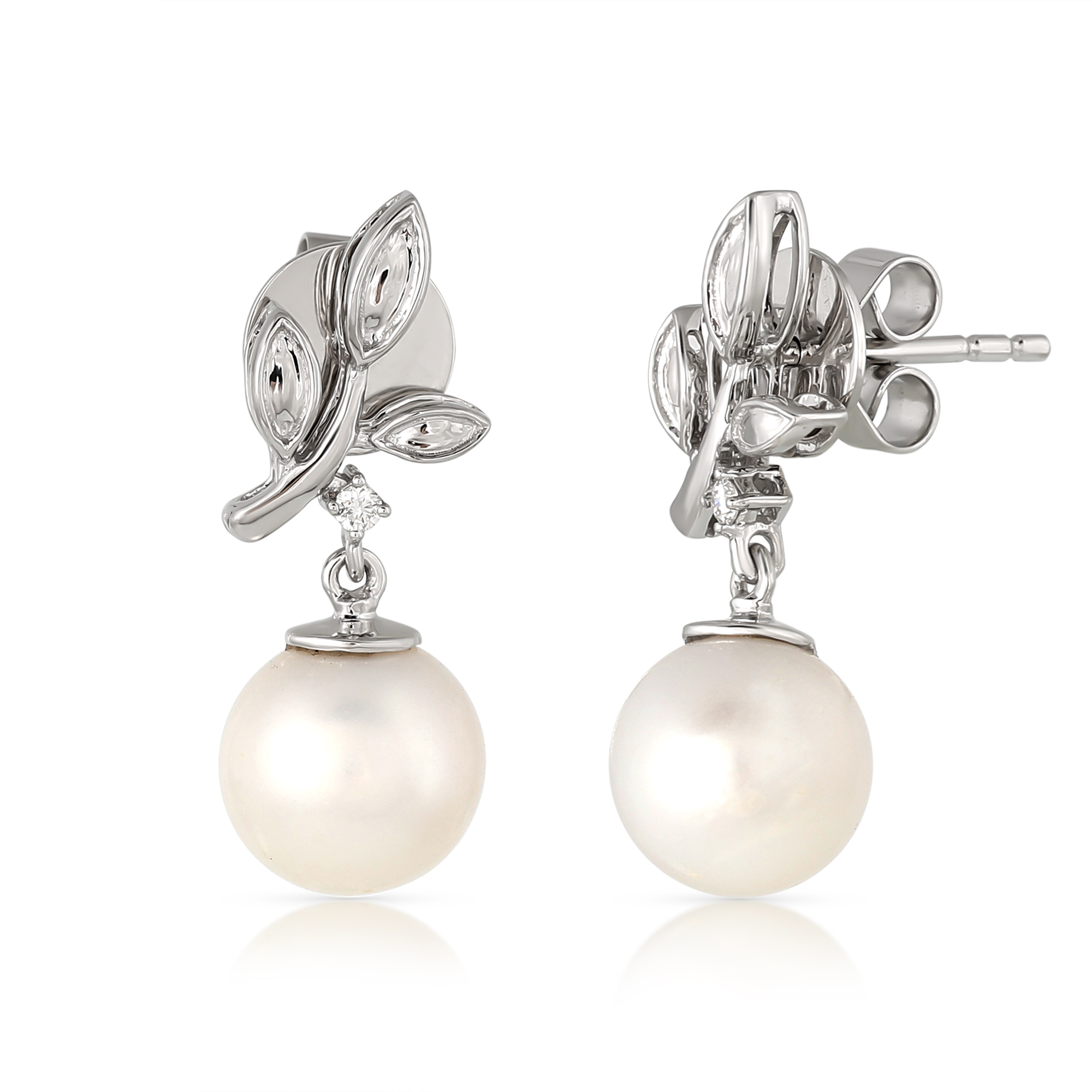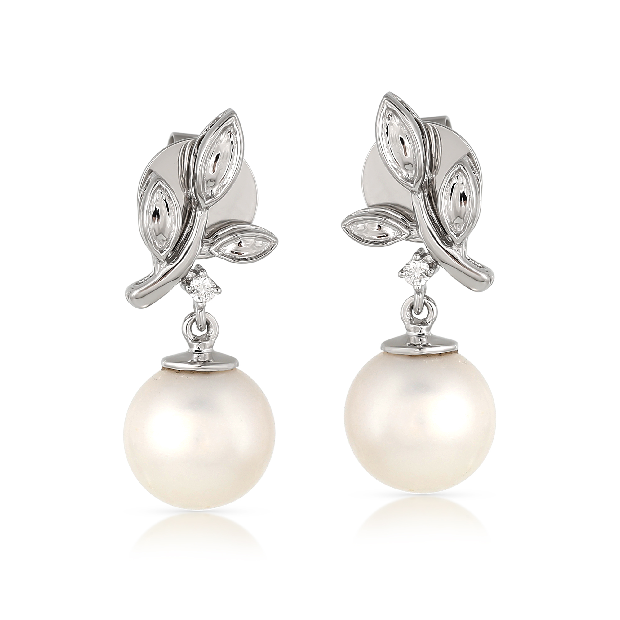 Cercei Aur Alb 14K, Perla 9.00 Ct , Diamante 0.05 Ct