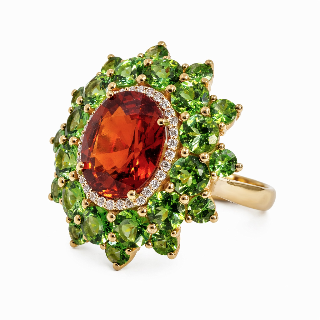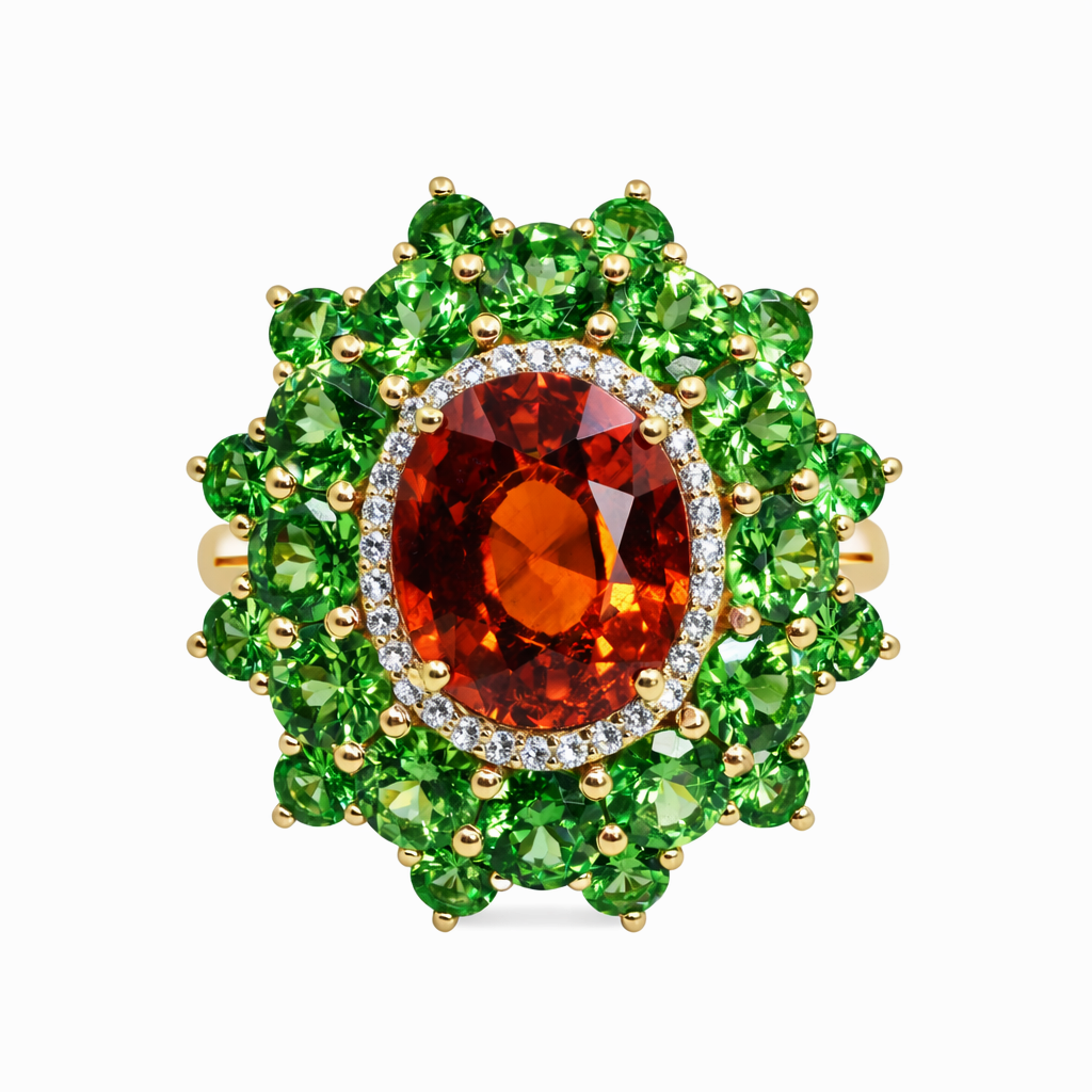 Inel Aur 18k, Spesartit 8.10 ct, Tsavorite 6.20 ct, Diamante 0.18 ct