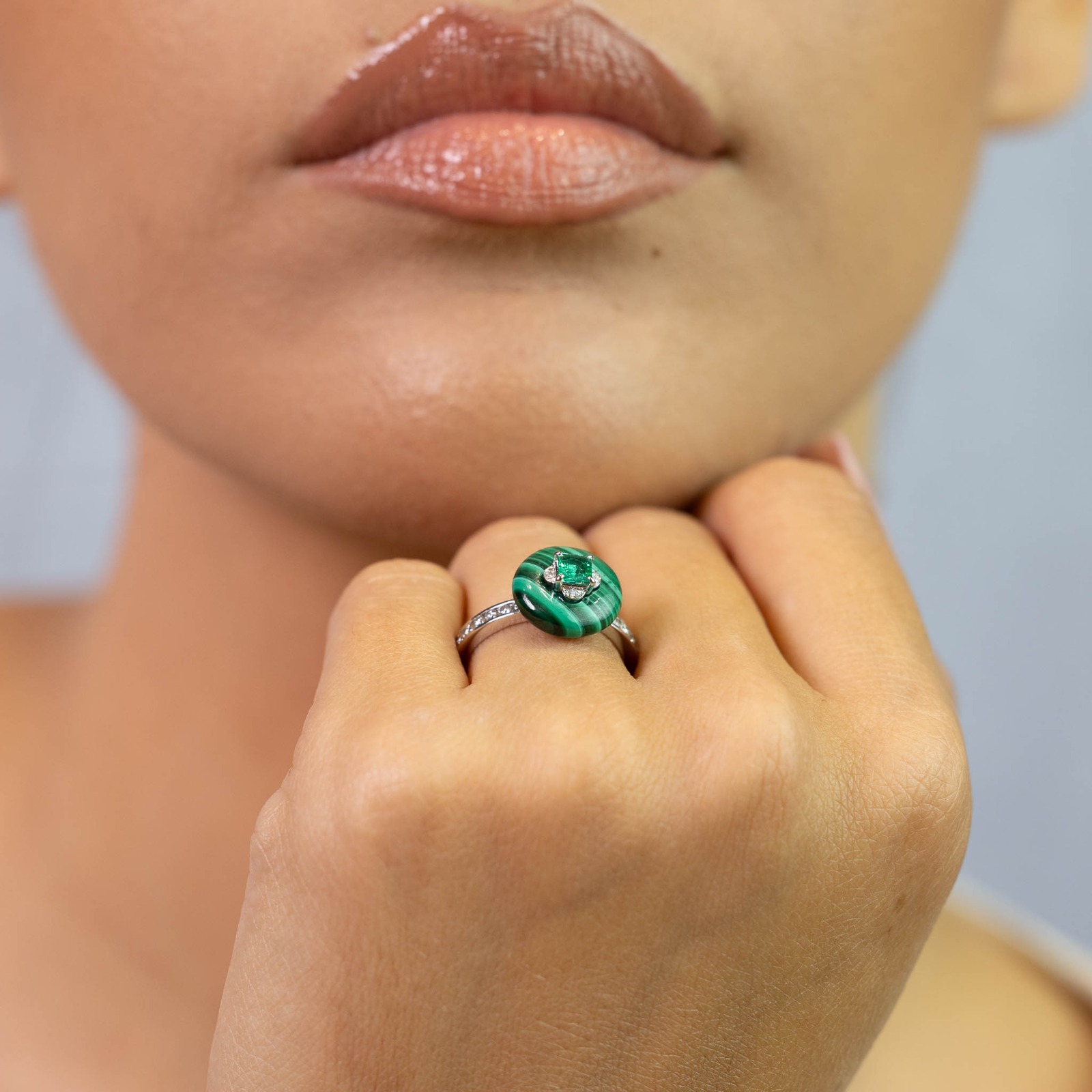 Inel Aur Alb 18K, Malachit 7ct, Smarald 0.25 ct, Diamante 0.62 ct