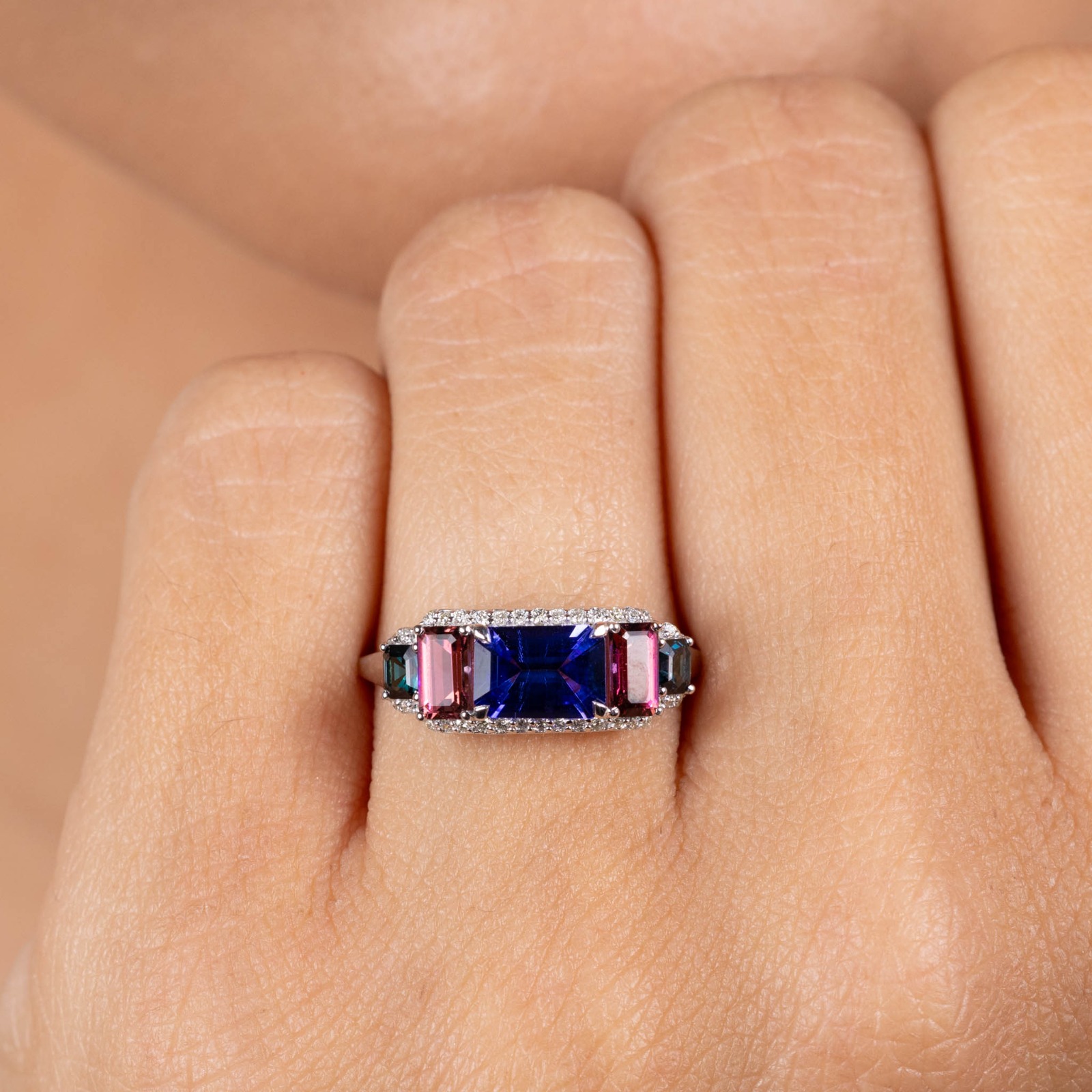Inel Aur Alb 18K, Tanzanite 0.88 Ct, Turmalina Roz 0.55 Ct, Turmalina Verde 0.24 Ct, Diamante 0.14 Ct