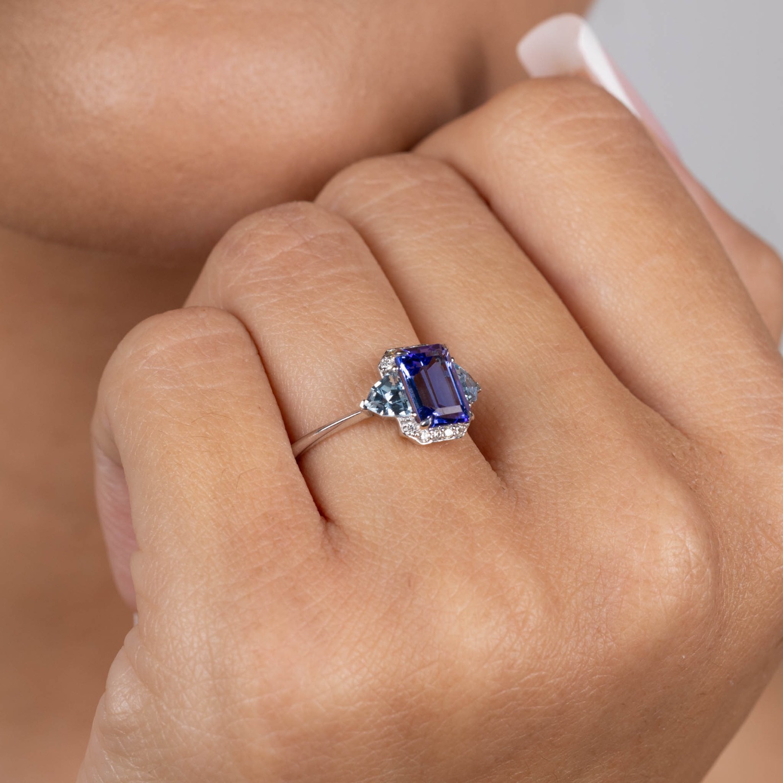 Inel Aur Alb 18K, Tanzanite 1.70 Ct, Aquamarine 0.54 Ct, Diamante 0.09 Ct