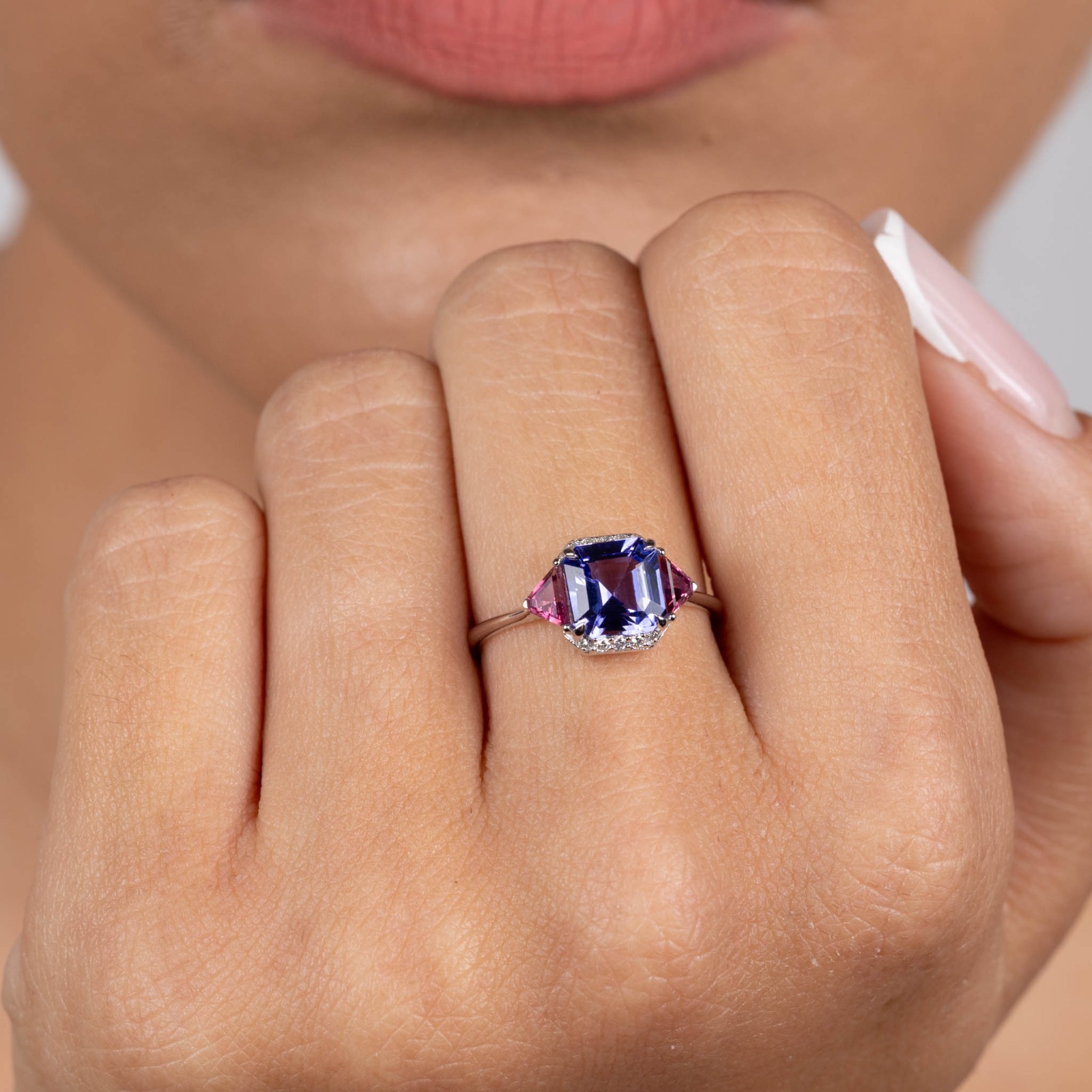 Inel Aur Alb 18K, Tanzanite 1.73 Ct, Turmalina Roz 0.34 Ct, Diamante 0.06 Ct
