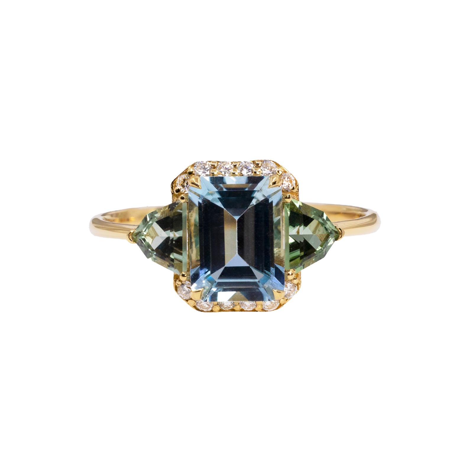 Inel Aur Galben 18K, Aquamarine 1.28 Ct, Turmalina Verde 0.56 Ct, Diamante 0.10 Ct