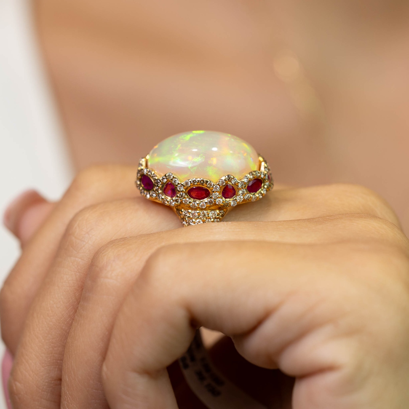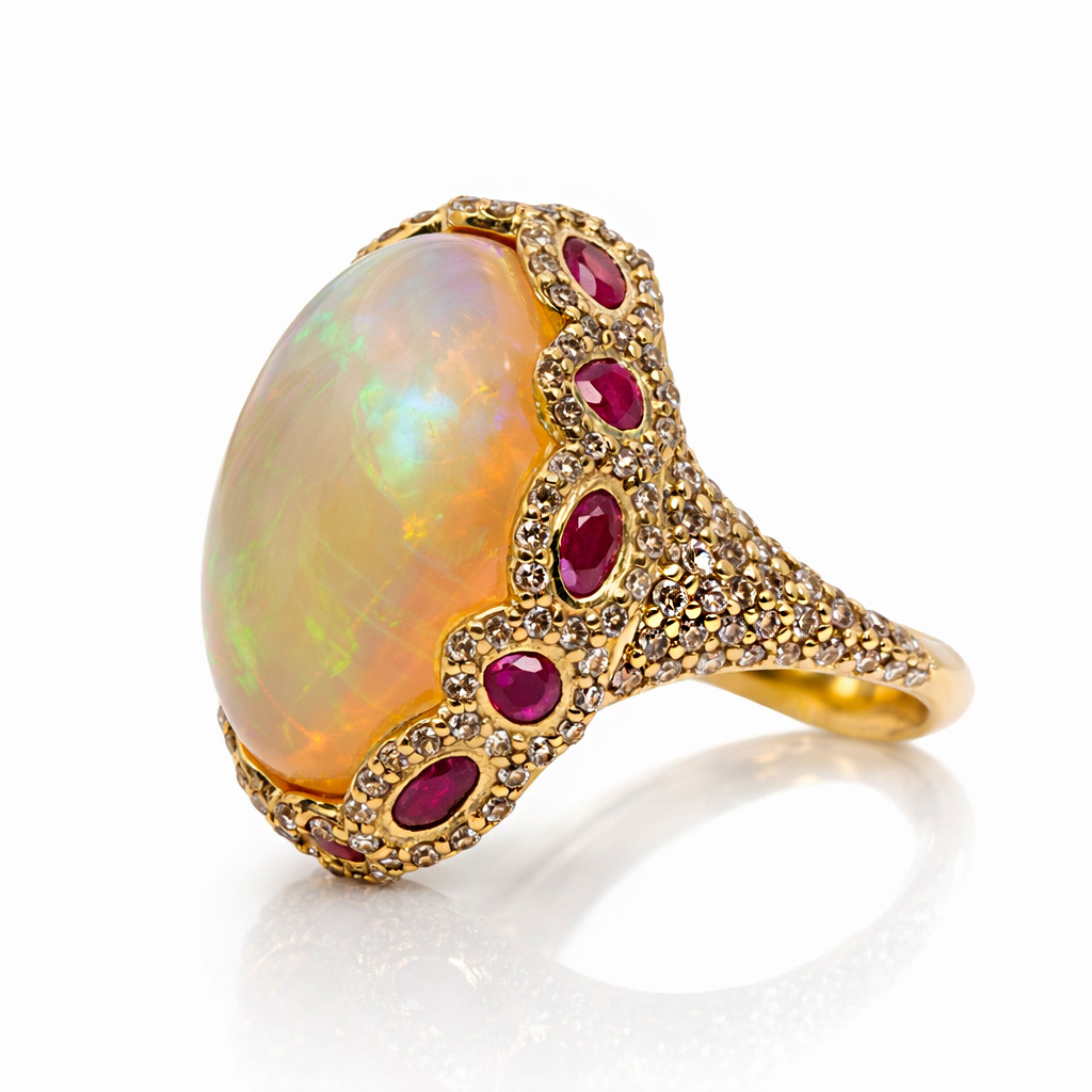 Inel Aur Galben 18k, Opal 20 ct, Rubin 1.42 ct, Diamante Champagne 1.17 ct