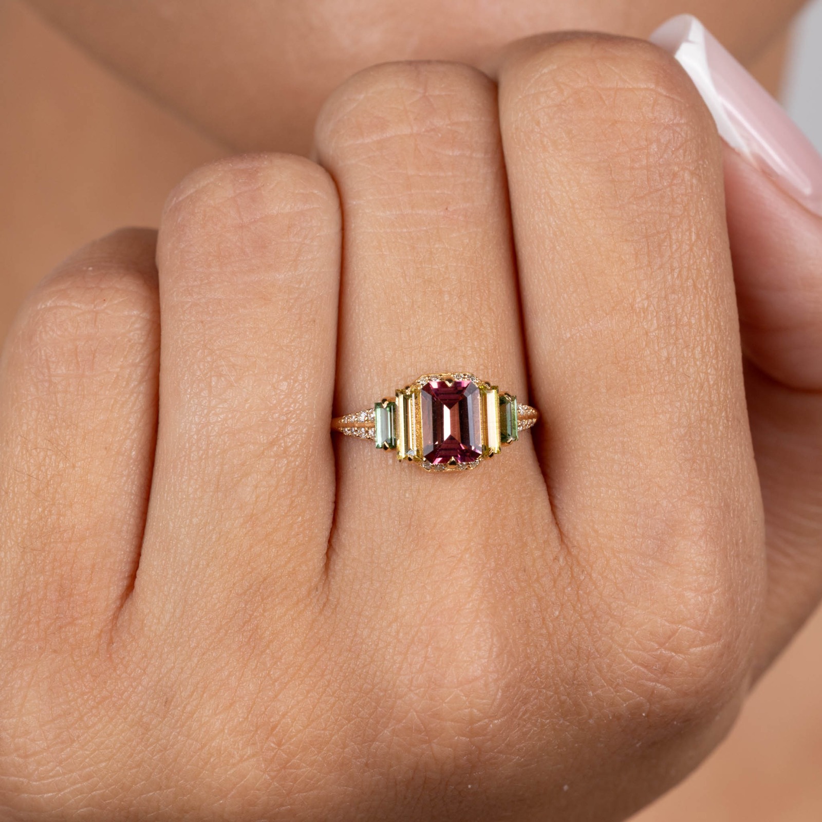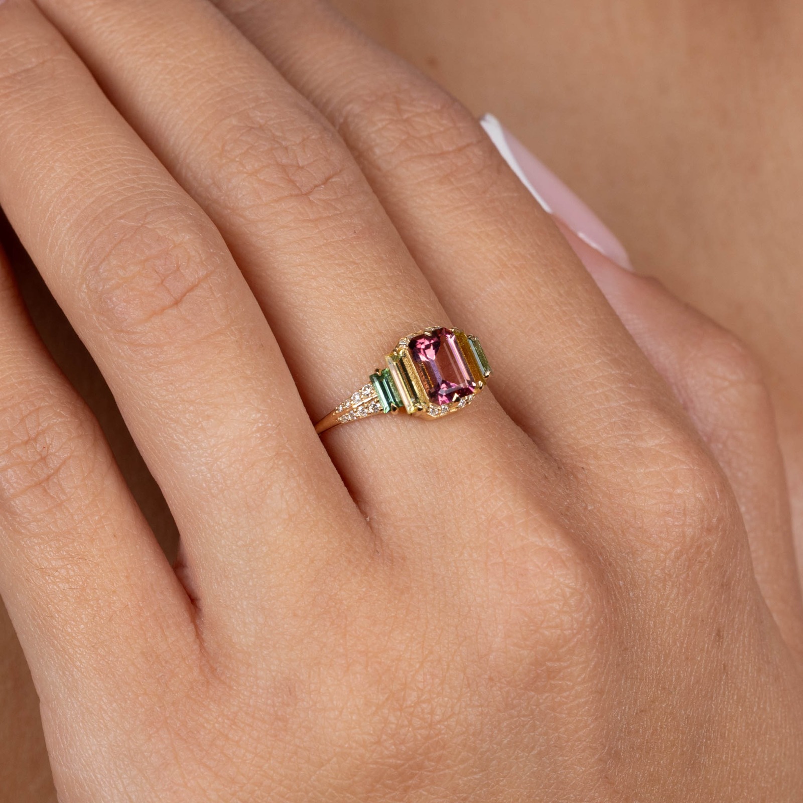 Inel Aur Galben 18K, Turmalina Roz 0.83 Ct, Turmalina Galbena 0.36 Ct, Turmalina Verde 0.26 Ct, Diamante 0.12 Ct