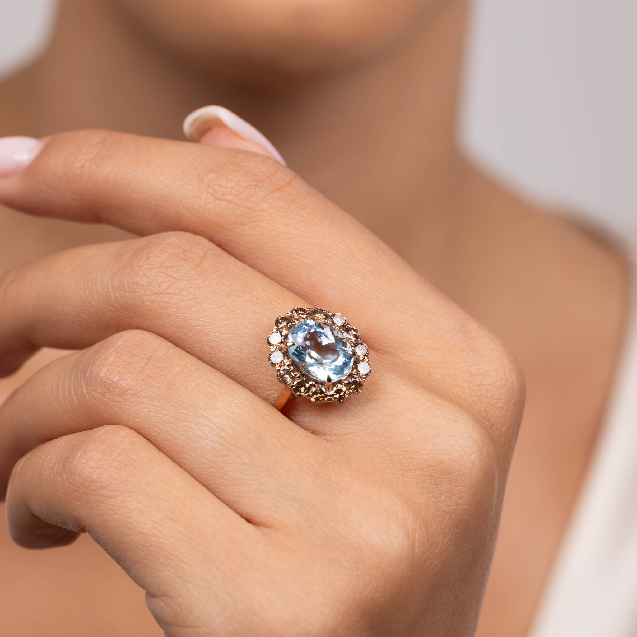 Inel Aur Roz 18k, Aquamarin 3.50 Ct, Diamante Champagne 1.35 ct