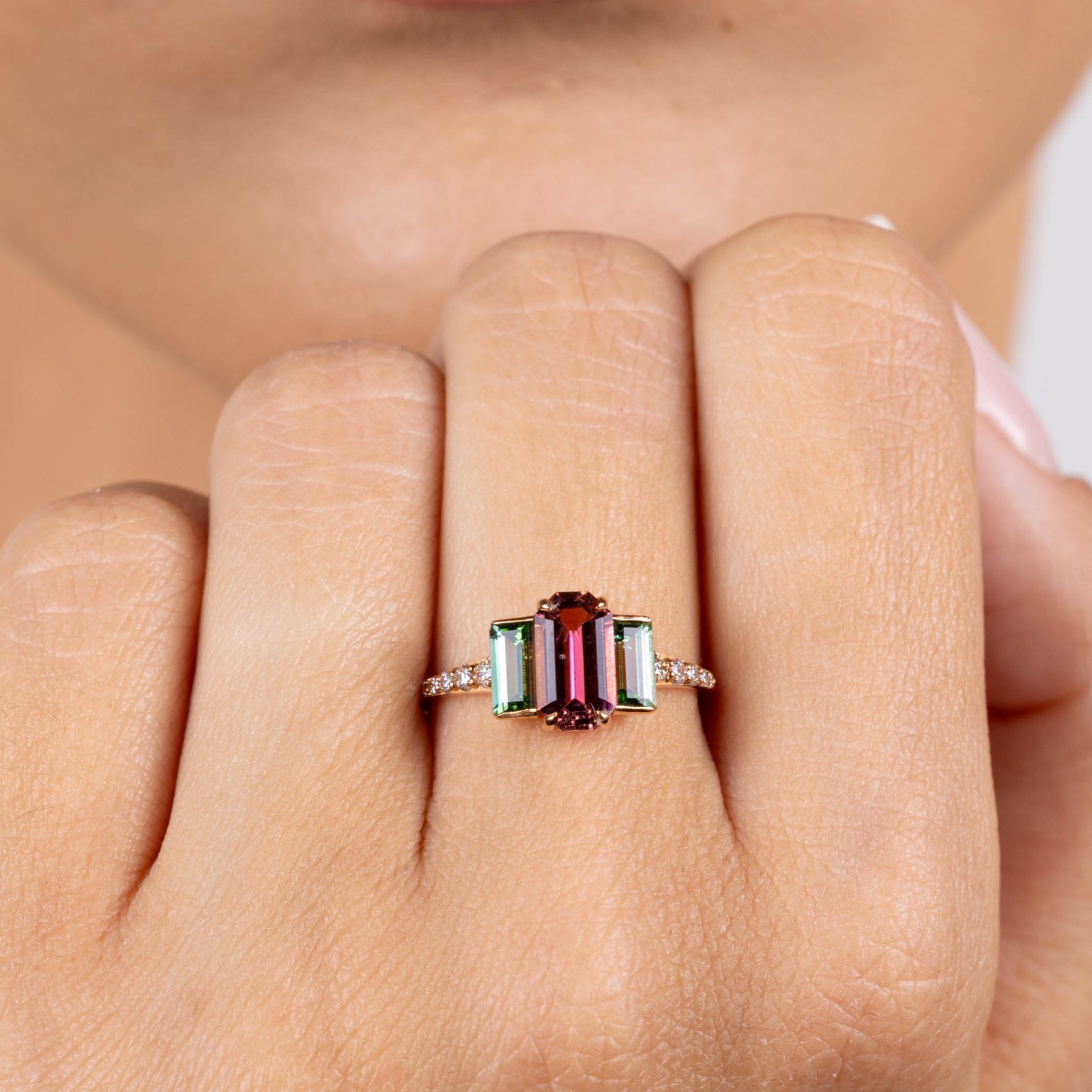 Inel Aur Roz 18K, Turmalina Roz 1.12 Ct, Turmalina Verde 0.65 Ct, Diamante 0.14 Ct