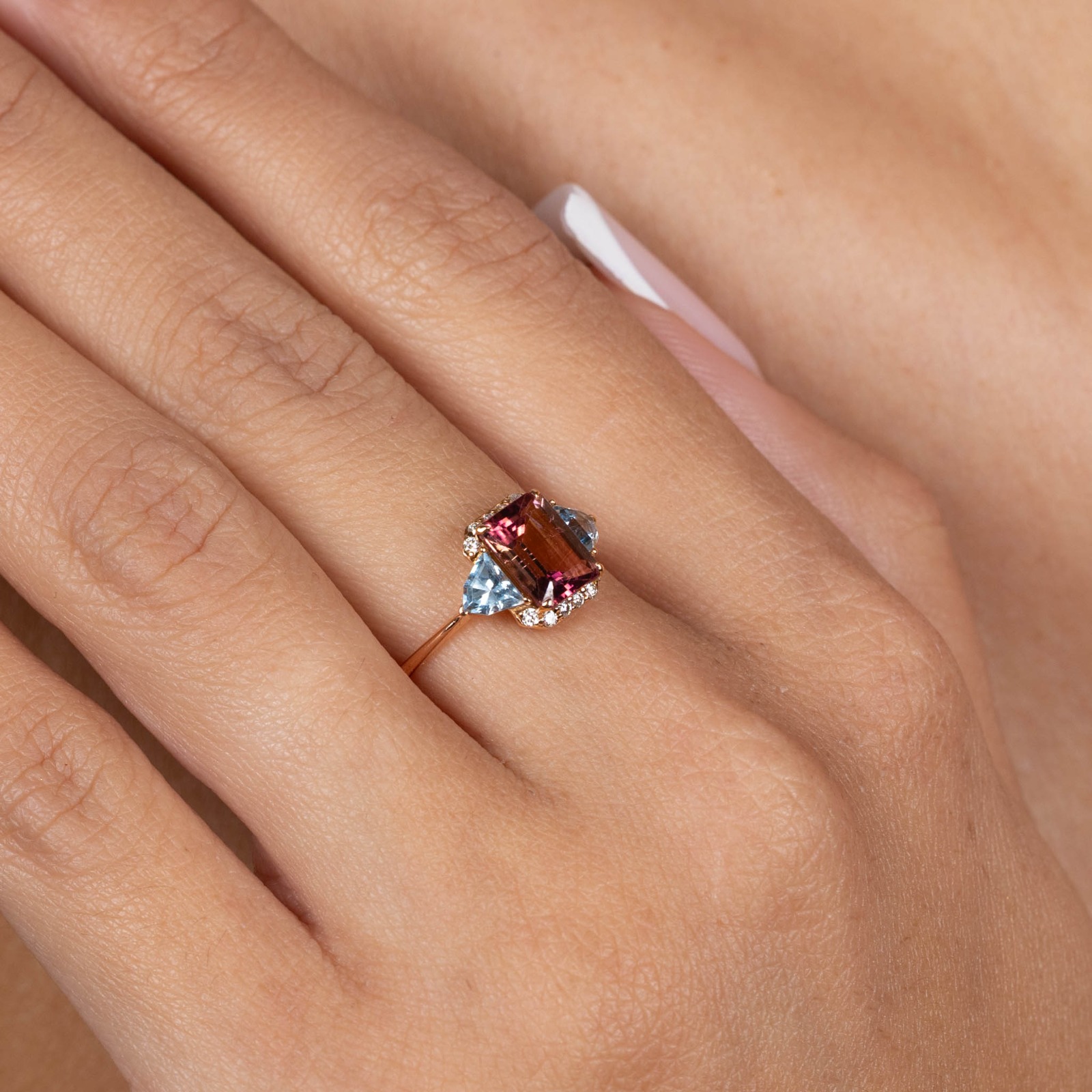 Inel Aur Roz 18K, Turmalina Roz 1.54 Ct, Aquamarine 0.48 Ct, Diamante 0.10 Ct