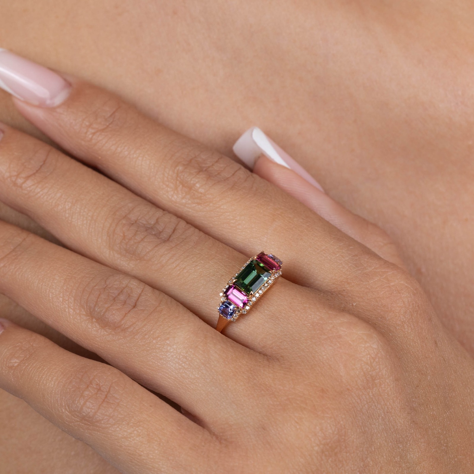 Inel Aur Roz 18K, Turmalina Verde 0.91 Ct, Turmalina Roz 0.57 Ct, Tanzanite 0.35 Ct, Diamante 0.14 Ct
