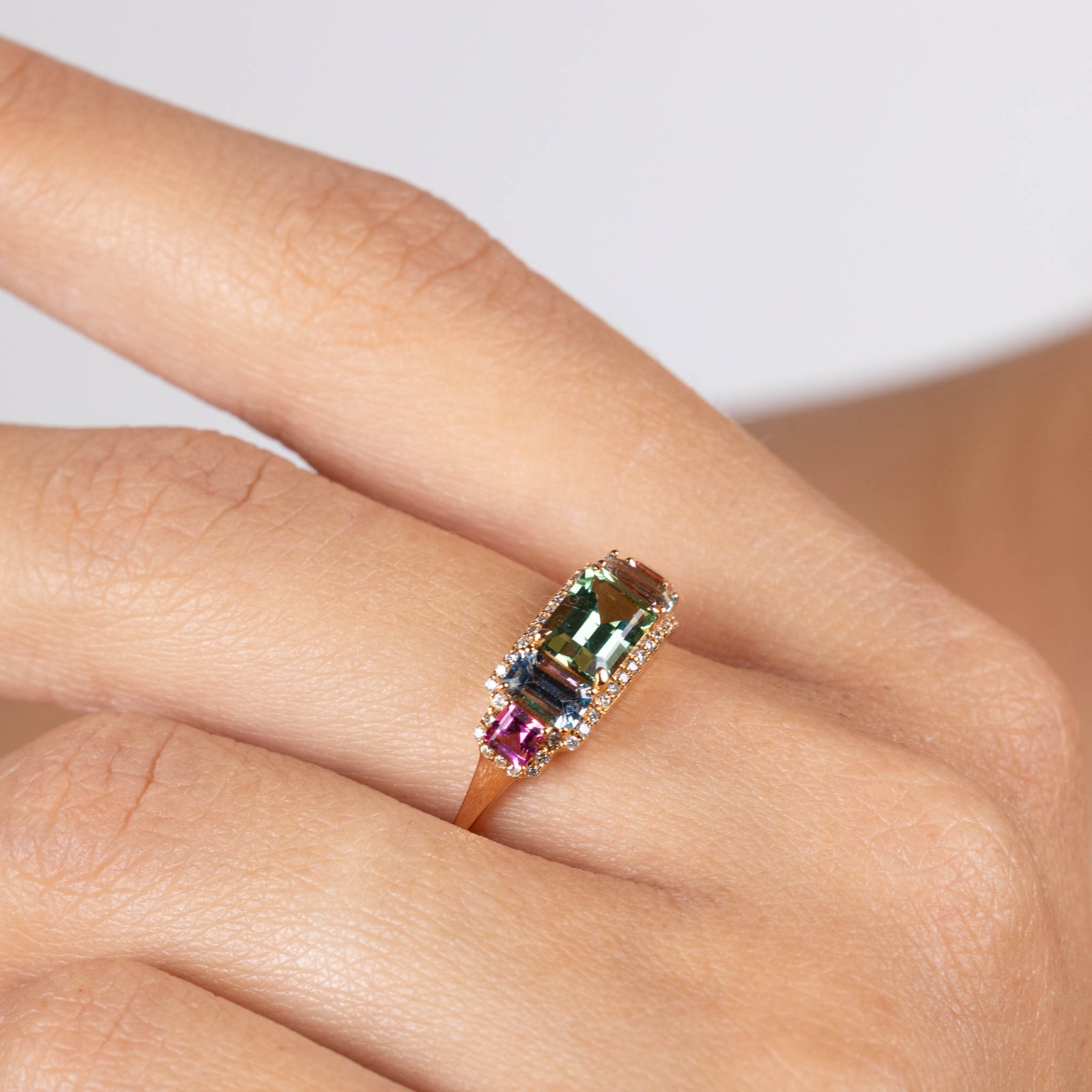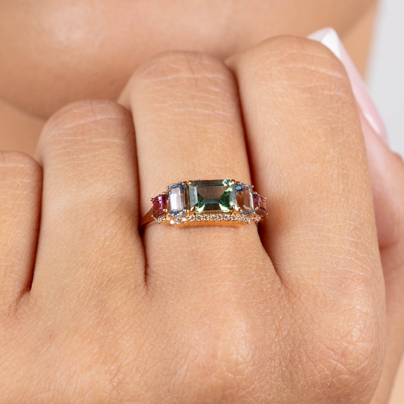 Inel Aur Roz 18K, Turmalina Verde 1.03 Ct, Aquamarine 0.53 Ct, Turmalina Roz 0.30 Ct, Diamante 0.14 Ct