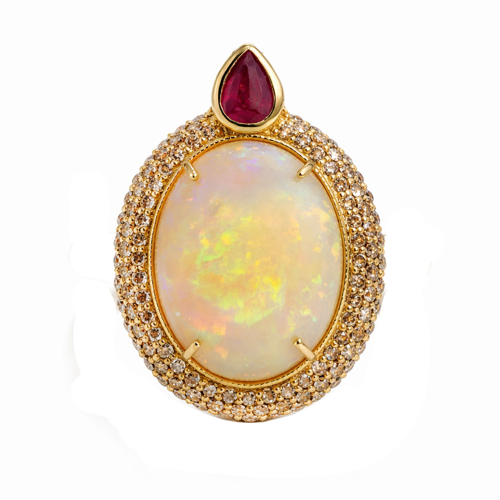 Pandantiv Aur Galben 18k, Opal 18.50 ct, Rubin 1.00 ct, Diamante Champagne 2.00 ct